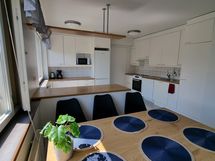 Tilaa isolle ruokapöydälle, Paljon kaappitilaa, Paljon työskentelytilaa, Suuri tiskipöytä, Astianpesukone, Sähköliesi, Liesikupu, Jää-pakastinkaappi
