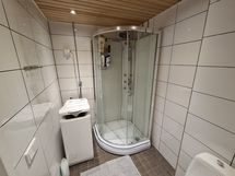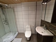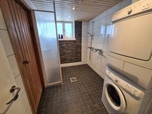 Erillisen WC:n kuvaus: Lattia ja seinät kaakeloitu, suihku, peili, pesukoneliitäntä.