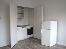 - Keittosyvennyksessä kaapistot, pesuallas, sähköliesi, pariovet. Jääpakastinkaappi (jenkkimalli) huonetilassa.