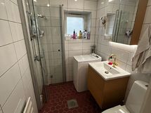 - Suihku, suihkuseinä, pyykinpesukoneliitäntä, pyykinpesukone, peilikaappi, allaskaappi