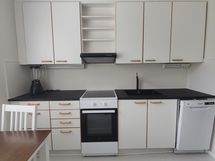 Liesi: keraaminen. Kylmäsäilytys: jääkaappi/pakastin. Varustus: liesituuletin, astianpesukone.