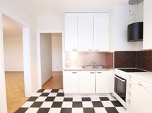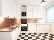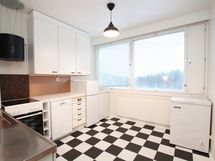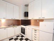 - Astianpesukone, jenkkijääkaappi, pakastin, keraaminen liesi, liesituuletin (aktiivihiilisuodatin). Seinät: välitilalevy, maalattu. Muovimattolattia.