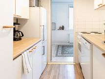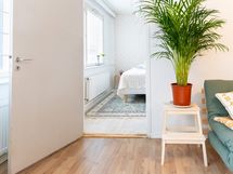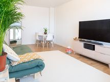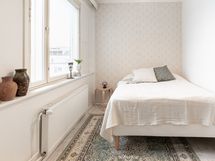 Tämä viidennen kerroksen sisäpihan puoleinen asunto on valoisa ja rauhallinen. Asunnon pohjaratkaisu mahdollistaa myös kimppa-asumisen.