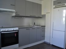 maalatut seinät, laminaattilattia, jääkaappi-pakastin, keraaminen liesi, liesituuletin