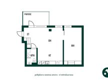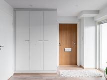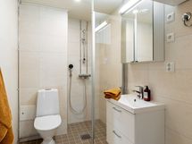 Varustus: suihkuseinä, pesukoneliitäntä, lattialämmitys, wc-istuin, suihku, peilikaappi, kylpyhuonekaapisto.