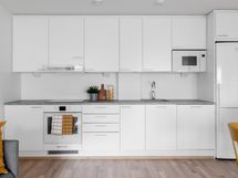 Liesi: induktio, erillisuuni, liesitaso. Työtasot: laminaatti. Kylmäsäilytys: jääkaappi/pakastin. Varustus: mikroaaltouuni, astianpesukone, liesituuletin / hormi.