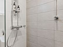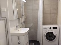 - Suihku, Suihkuseinä, Pesukone, Peilikaappi, Allaskaappi, Rättipatteri, Laattalattia, Laattaseinä