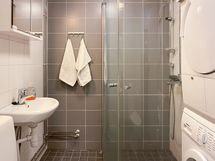 - Pesutilojen varusteet: WC-istuin, suihku, suihkuseinä, pesukone, kuivausrumpu, peilikaappi ja pesuallas. Pesutilojen kuvaus: Pesutilat on varusteltu pyykinpesukoneella sekä kuivausrummulla.