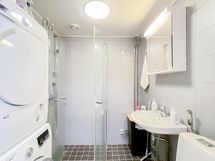 - Pesutilojen varusteet: WC-istuin, suihku, suihkuseinä, pesukone, kuivausrumpu, pesuallas ja peilikaappi. Pesutilojen kuvaus: Pesutilat on varusteltu pyykinpesukoneella sekä kuivausrummulla.