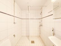 - Pesutilojen kuvaus: laatoitettu kylpyhuone, paikka pesukoneelle, suihku.