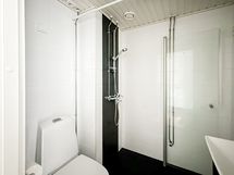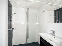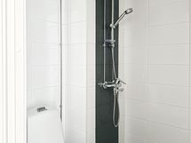 Varustus: suihkuseinä, wc-istuin, suihku, peilikaappi.