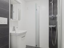 - Suihku, Pesukonevalmius, Peilikaappi, Allaskaappi, Laattalattia, Laattaseinä, Lattialämmitys, Suihkuseinä