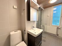 - Varustus: suihkuseinä, pesukoneliitäntä, lattialämmitys, wc-istuin, suihku, peilikaappi, kiinteät valaisimet, kylpyhuonekaapisto.