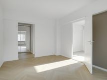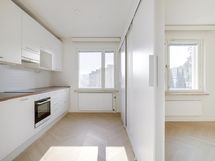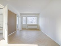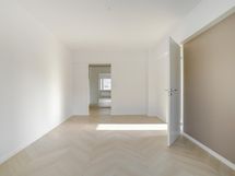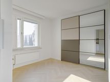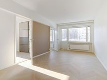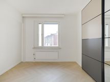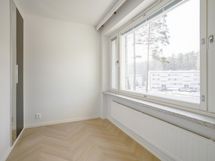 Asunnossa on suuret ikkunat, jotka tuovat runsaasti luonnonvaloa ja tekevät tilasta avaran ja viihtyisän. Pienempi makuuhuone isolla ikkunalla sopii mainiosti myös työhuoneeksi. Tilavampaan päämakuuhuoneeseen mahtuu hyvin parisänky, ja säilytystilaa tarjoaa iso liukuovellinen vaatekaappi.