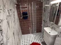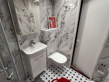 - Suihku, Suihkuseinä, Pesukonevalmius, Peilikaappi, Laattalattia, Halogeenivalot, Laattaseinä, Allaskaappi, Rättipatteri