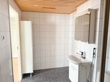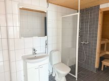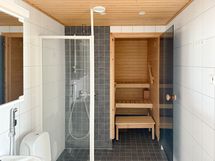 Kylpyhuone on kokonaan laatoitettu ja sen tumma värimaailma tuo tilaan rauhallista tunnelmaa harmaan lattian sekä harmaan ja valkoisen yhdistelmäseinän kautta. Kylpyhuoneesta löytyy oma sauna, jossa voit rentoutua juuri silloin kun sinulle sopii.