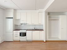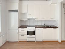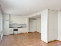 Tämä tilava ja valoisa yksiö alkovilla hurmaa tammilaminaatilla, joka luo lämpimän ja ajattoman pohjan sisustukselle. Asunnon keittiössä on vaaleat valkoiset kaapinovet, valkoinen välitilan laatta ja tumma puutyötaso, jotka muodostavat tyylikkään ja modernin kokonaisuuden. Astianpesukone kuuluu varusteisiin.
