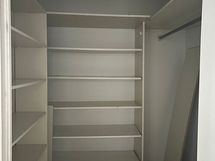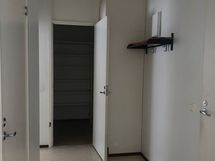 Lattiassa on vaalea ja siisti muovimatto. Seinät sekä kaapit ovat valkoiset ja asunnossa on vaatehuone.