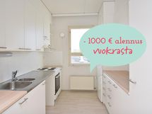 KAMPANJA: Uusiin vuokrasopimuksiin -1000€ vuokra-alennus ensimmäisestä täyden kuun vuokrasta, kun sopimus alkaa viimeistään 29.4.2026. Sopimukseen sitouduttava vuodeksi. Mikäli sopimus irtisanotaan ennen ensimmäistä mahdollista irtisanomispäivää, tulee maksettavaksi 1 kk vuokraa vastaava sakko. Kampanjoiden yhteydessä vakuus vain 350€. Asunto on mahdollista vuokrata myös ilman kampanjaa.