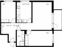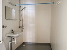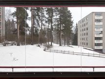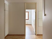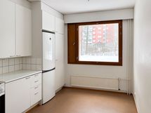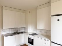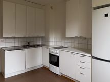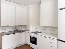 Keittiöön mahtuu mukavasti ruokailuryhmä ja varustukseen kuuluu liesi sekä jääpakastinkaappi. Astianpesukoneelle on tilavaraus. Kodin pintamateriaalit ovat käytännölliset: lattiassa on muovimatto ja seinät ovat maalatut. Lasitetulta parvekkeelta avautuvat vehreät näkymät. Kylpyhuoneessa on harmaa massalattia, vaaleat seinät sekä liitäntä pyykinpesukoneelle.