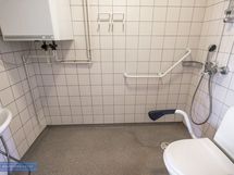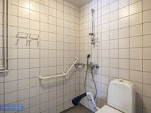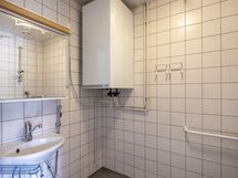 Kylpyhuone on tilava. Asunnossa on huomioitu esteettömyys.