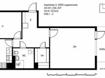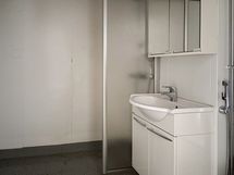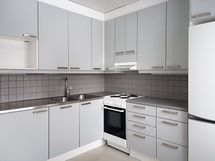 Lattiat ovat harmaata muovimattoa ja seinät ovat maalatut. Keittiön kaapit ovat harmaat ja välitila on harmaata laattaa. Astianpesukoneelle on tilavaraus. Varustetasoon kuuluvat jääpakastinkaappi ja liesi. Kylpyhuoneessa on vaaleat seinät, lattia on harmaata laattaa. Suihkuseinä on kätevä. Kaappitilaa on peilikaapissa ja allaskaapissa. Rättipatterin päälle saa pyyheliinan kuivumaan. Pyykinpesukoneelle on tuloliitäntä.