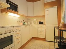 Keittiön varusteet: Jääkaappipakastin, uuni, liesi ja liesituuletin. Liesi: Valurautaliesi. Työtason materiaali: Laminaatti.