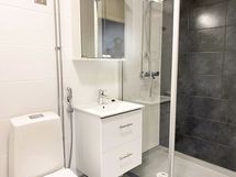 Kodissa on neutraalinsävyinen muovimattolattia ja vaaleat maalatut seinät, jotka tekevät tilasta helposti sisustettavan. Keittiön pintamateriaalit ovat ajattomat ja laatoitus valkoinen. Kylpyhuone on tyylikkäästi ja modernisti remontoitu ja sinne saa liitettyä oman pyykinpesukoneen.