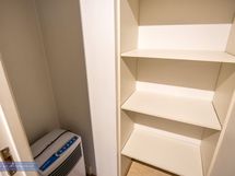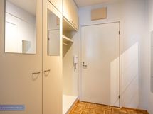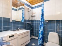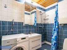 Tilavassa kylpyhuoneessa on paikka ja liitäntä pyykinpesukoneelle ja tällä hetkellä vuokranantaja puolesta pyykinpesukonekin valmiiksi tulevalle vuokralaiselle. Eteisessä myös erillinen vaatehuone ja lisäksi kiinteitä kaapistoja.