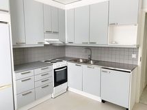 Lattiat ovat harmahtavaa muovimattoa. Keittiön kaapit ovat siistit harmaat ja välitila on harmaata laattaa. Astianpesukoneelle on tilavaraus. Jääpakastinkaappi ja liesi kuuluu varustetasoon.