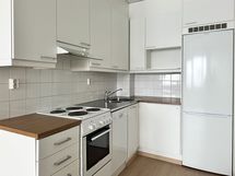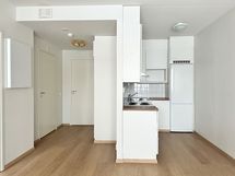 Tässä Lumo-kodissa on kompakti pohjaratkaisu. Lattia on laminaattia ja seinät ovat maalatut. Keittiö on avoin olohuoneeseen, mikä tuo tilan tuntua. Keittiössä on valkoiset kaapistot metallivetimillä, välitilan laatoitus on valkoinen ja työtasot lämpimän puun sävyiset. Varustukseen kuuluva astianpesukone tuo ripauksen arjen luksusta.