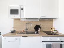 Liesi: sähköliesi. Kylmäsäilytys: jääkaappi. Varustus: liesituuletin, astianpesukone.