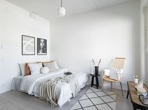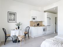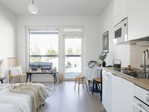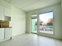 Asunnossa on tavallista korkeampi huonekorkeus ja sen lisäksi lähes lattiaan asti ulottuvat isot ikkunat, joten asunto on todella valoisa ja neliöitään isomman tuntuinen. Oleskelutilan jatkeena on viihtyisä parveke, jossa on mukava istuskella aurinkoisella kelillä. Asunnossa on vesikiertoinen lattialämmitys ja näin ollen pattereita ei tarvita, mikä helpottaa kalusteiden sijoittelua. Keittiöstä löytyvät kaikki modernit laitteet ja laatoitetussa kylpyhuoneessa on luonnollisesti pyykinpesukoneliitäntä.