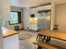 - Tilaa isolle ruokapöydälle, Paljon kaappitilaa, Paljon työskentelytilaa, Suuri tiskipöytä, Puutasot, Terästasot, Astianpesukone, Liesituuletin, Induktioliesi, Sähköliesi, Liesikupu, Jääkaappi, Pakastin