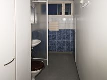 Tilavassa ikkunallisessa kylpyhuoneessa on massalattia ja seinät ovat osalaatoitettu valkoisella sekä sinisellä sävyllä. Pyykinpesukoneelle on mahdollisuus.