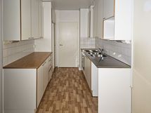 Keittiössä on valkoiset kaapit metallivetimin ja puureunuksin, valkoinen välitilan laatta sekä puunsävyiset työtasot sekä hyvin säilytys- ja työtilaa. Normaalikokoiselle astianpesukoneelle löytyy paikka ja liitännät.