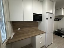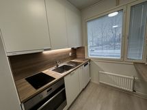 Keittiö on toimiva ja moderni. Valkoiset kaapistot, puunsävyinen työtaso ja hyvä varustelu luovat viihtyisän kokonaisuuden. Astianpesukone ja uudet kodinkoneet helpottavat arkea.