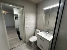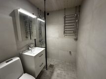 Kylpyhuone on täysin uusittu vuonna 2025 ja sen vaaleat laattapinnat ja modernit kalusteet tekevät tilasta raikkaan ja helppohoitoisen. Lattialämmitys tuo mukavuutta arkeen ja suihkuseinä antaa selkeyttä tilaan.