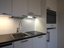 Keittiön varusteet: Astianpesukone, liesituuletin ja jääkaappi pakastelokerolla, monitoimiuuni. Työtason materiaali: Laminaatti.