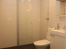 Pesutilojen varusteet: WC-istuin, suihku, pesukoneliitäntä, lattialämmitys ja peili.