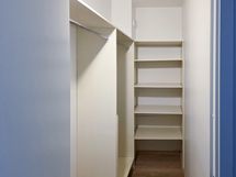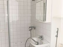 Keittiössä on puuta jäljittelevät kaapistot puisilla vetimillä. Työtasot ovat marmoria jäljitteleviä ja välitila on valkoista sekä sinistä laattaa. Kylpyhuoneessa on valkoiset laatta lattiat sekä seinät. Pyykinpesukoneelle on liitännät suihkun hanassa.