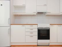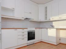 Keittiössä on kotikokille runsaasti säilytystilaa ja sen varusteena on keraaminen liesi sekä jääpakastinkaappi. Keittiön ikkunanäkymät ovat etelään/keskustan suuntaan ja tilaan mahtuu suurempikin ruokaryhmä.