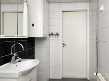 Huoneiston lattiapintamateriaalina on laminaatti ja seinät ovat maalipinnalla. Kylpyhuone on laatoitettu tyylikkäästi valkoisilla isoilla laatoilla jossa tehosteena tumman harmaata laattaa. Tilavaraus on pyykinpesukoneelle.