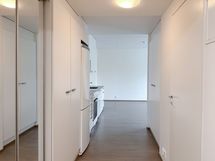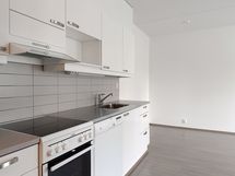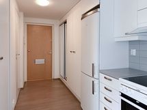 Näppärä pikkukoti sijaitsee 1. kerroksessa ja talossa on huomioitu esteettömyys. Eteisessä on peililiukuoven takana naulakko sekä säilytystilaa kaapistossa. Keittotilan varusteisiin kuuluu jääpakastinkaappi, keraaminen liesi ja astianpesukone. Huoneen yhteydessä on alkovi, jossa sopiva tila 120cm leveälle sängylle. Huoneiston lattiamateriaalina on harmaan sävyinen tammilaminaatti ja seinät vaalealla maalipinnalla. Kodin ikkunoissa on sälekaihtimet.