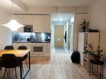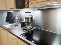 Liesi: induktio, erillisuuni, liesitaso. Työtasot: laminaatti. Kylmäsäilytys: jääkaappi/pakastin. Varustus: liesituuletin, astianpesukone, kiinteät valaisimet.