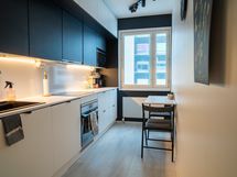 Keittiössä kaikki nykyaikaiset kodinkoneet integroituina. Siellä on myös seinään kiinnitetty aamupalapöytä. Runsaasti säilytystilaa.