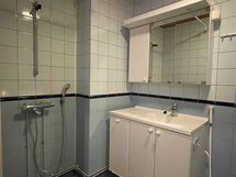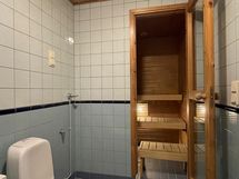 Sauna, sähkökiuas, kylpyhuone, suihku, peilikaappi, pesukoneliitäntä.