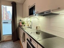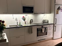 Asunnon keittiön varustukseen kuuluu jääkaappi/pakastin, integroidut astianpesukone, mikroaaltouuni sekä uuni/liesi. Kylpyhuoneesta löytyy paikka ja liitäntä pyykinpesukoneelle. Tämän asunnon yhteydessä vuokrataan autohallipaikka hintaan 60€/kk.