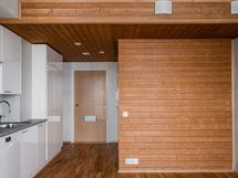 Asunnon lattiat on tammilautaparkettia. Rakennuksen henkeen sopivaa fiilistä luo rouhea betoniseinä, jollainen löytyy jokaisesta huoneistosta. Muut seinät valkoiseksi maalattu. Keittiöt on varustettu induktioliedellä, erillisuunilla, jääkaappi-pakastimella, astianpesukoneella ja kiiltävän valkoisilla ja raikkaan skandinaavisilla kalusteilla. Tasot vaaleanharmaata betoninsävyistä laminaattia. Ikkunoissa sälekaihtimet ja verhokiskot valmiina, lämmitys vesikiertoisella patterilämmityksellä ja ilmanvaihto koneellinen. Kosteissa tiloissa kaakeloidut seinät ja lattiat ja mukavuuslattialämpö. Asuntoon kuuluu irtainvarasto ja yhteiskäytössä kaksi ulkoiluvälinevarastoa. Taloyhtiössä myös sauna, joka on asukkaiden käytössä erillismaksusta.