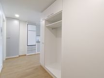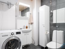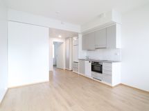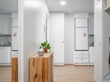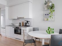 Tämän kuudennen (6/7) kerroksen kivan kaksion sisustusmateriaalit ovat tyylikästä vaaleaa värimaailmaa, valkoiset maalatut seinät ja lattiat puunväristä laminaattia. Keittiötilasta löytyy nykyaikainen koneistus: jääkaappipakastin, keraaminen liesi, erillisuuni ja astianpesukone. Kaakeloidussa kylpyhuoneessa on paikka omalle pyykkikoneelle ja kuvausrummulle. Lasitetulla parvekkeella puolestaan viihdyt pitkälle syksyyn saakka!